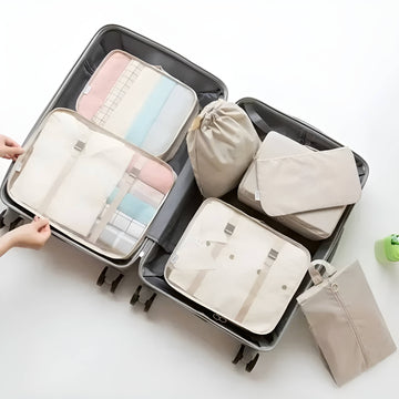 You get seven handy bags: three different sizes for clothes, one for toiletries that won't leak, and a special bag for shoes. The whole set is made from tough cotton that won't weigh down your suitcase. The zippers and stitching are built to last, even if you're always on the go.