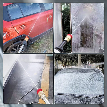 Included aretwo interchangeable nozzlesthat produce two different spray patterns for cleaning tough stains, wetting the automobile body, and bathing pets.