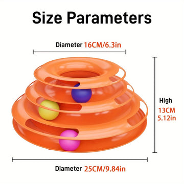 Three bright colored balls roll around inside round tracks that sit on top of each other. Your cat swats at them and the balls go flying around the curves. It gets their hunting brain going and keeps them busy.