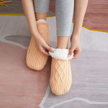 These indoor socks are designed to provide foot coverage and insulation during colder conditions. The surface is structured to retain warmth from toe to calf and includes non-slip elements for indoor walking. Built with a stretchable frame, the socks can be adjusted at the top edge and used while sleeping or resting indoors. The underside includes grip features intended for secure movement on smooth floors. Suitable for use in home settings or non-clinical indoor environments.