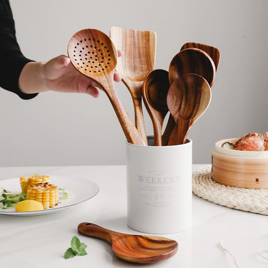 Elevate your cooking experience with the Natural Teak Wood Kitchen Set, designed for durability, sustainability, and timeless style. Unlike cheap plastic or metal tools that damage cookware and wear out quickly, this premium set provides reliable performance while protecting your pots and pans. Built from high-quality teak wood, it brings a touch of natural elegance into any kitchen.