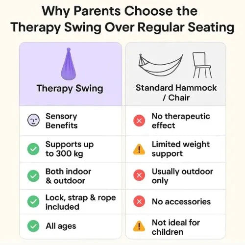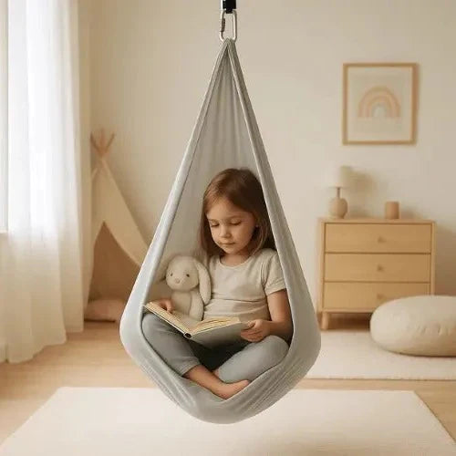 This enclosed swing is designed to provide a calming motion experience and can be used in both indoor and outdoor settings. Offered in two sizes, it supports high load capacity and includes essential components for secure setup.