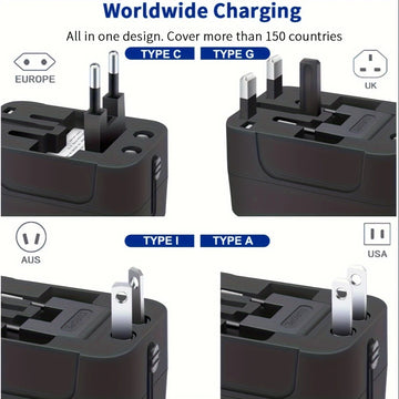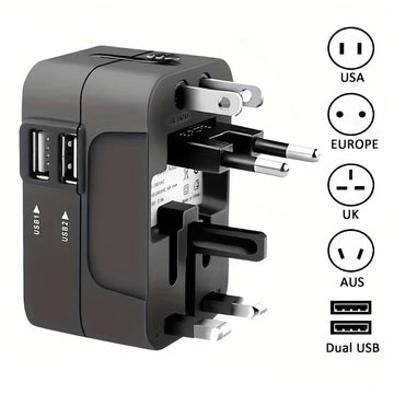 Designed for international use, this adapter includes dual USB ports to help power multiple devices while traveling. Suitable for a range of electronic items, it provides a practical charging solution during trips.